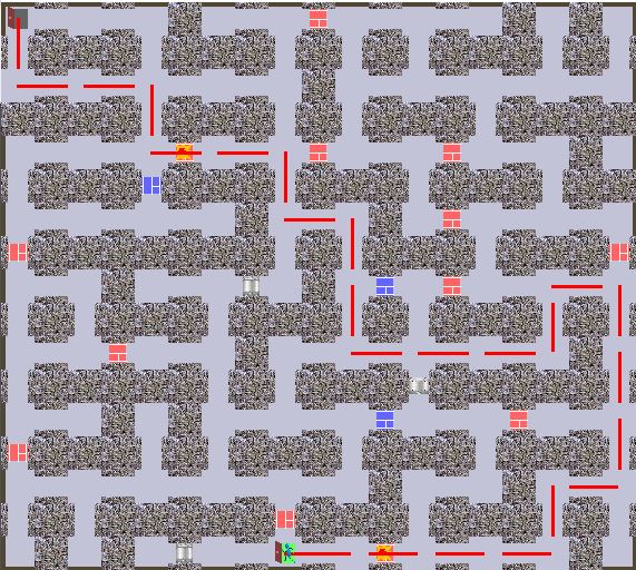 There are 3 types of walls: normal brick walls (displayed by the program in red), thick brick walls (displayed by the program in blue), and metal walls.